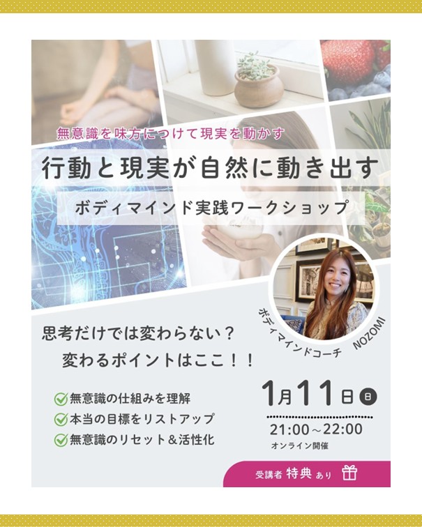 2ッ星栄養コンシェルジュでボディマインドコーチでもあるのぞみさんが1月11日(日)にオンラインにてボディマインド実践ワークショップ、『行動と現実が自然に動き出す』にて講師を務められます☆