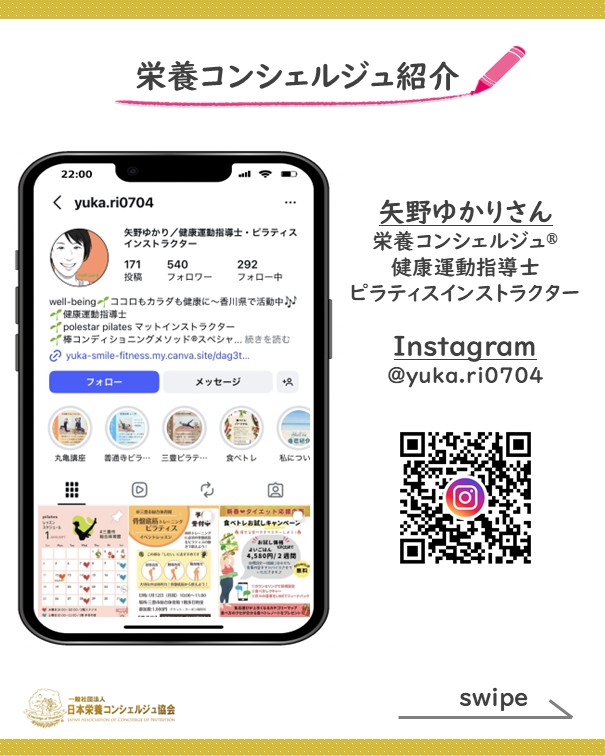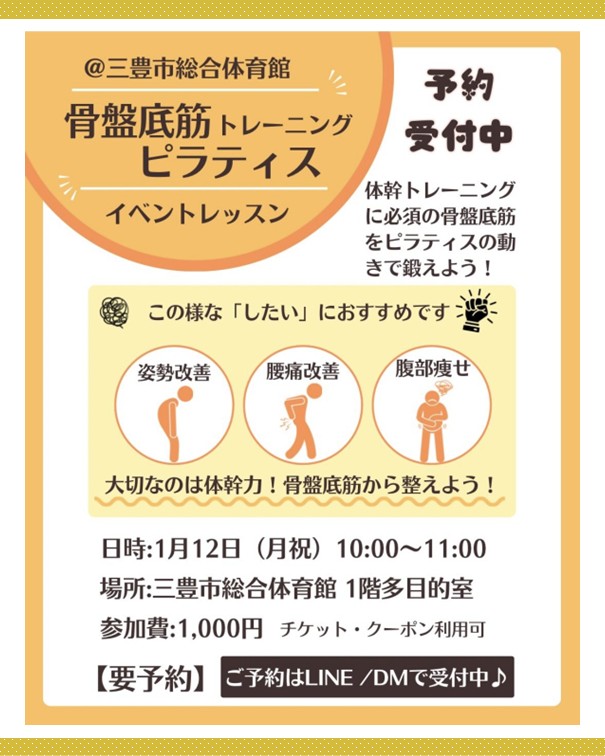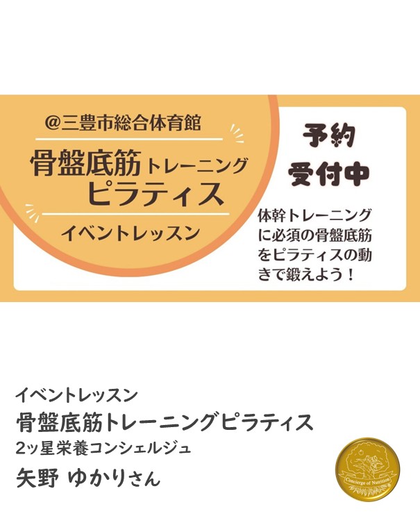 2ッ星栄養コンシェルジュで健康運動指導士・ピラティスインストラクターの矢野ゆかりさんが1月12日(月祝)に香川にてイベントレッスン、『骨盤底筋トレーニングピラティス』にて講師を務められます☆