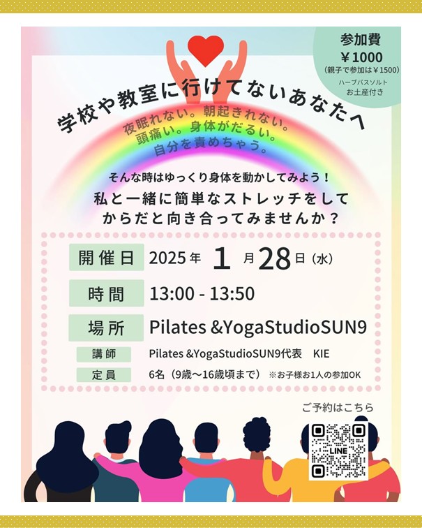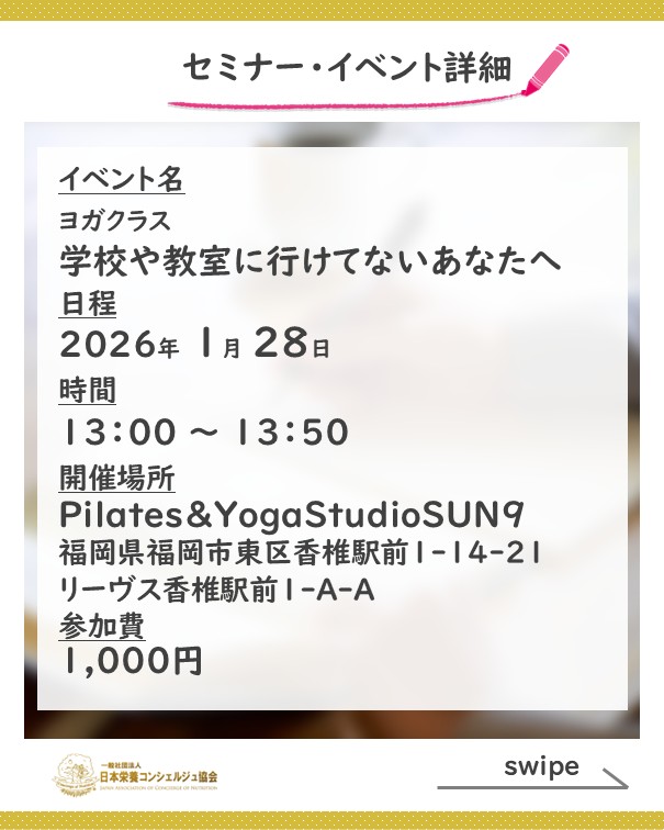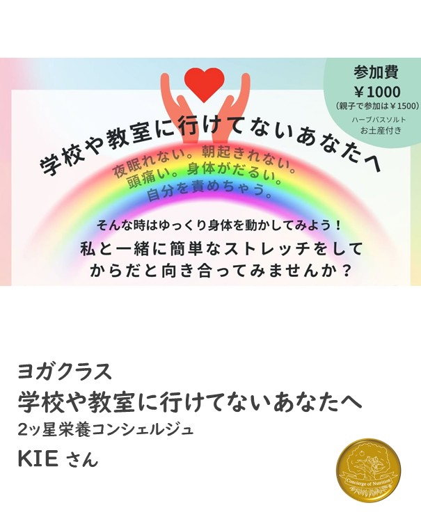 2ッ星栄養コンシェルジュでインストラクターのKIEさんが1月28日(水)に福岡にて学校や教室に行けていない子どもたち向けのヨガクラスを開催されます☆
