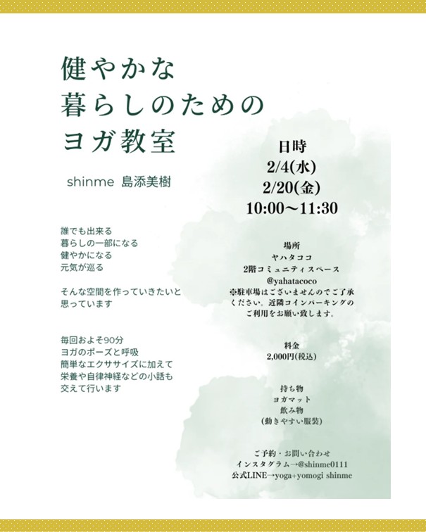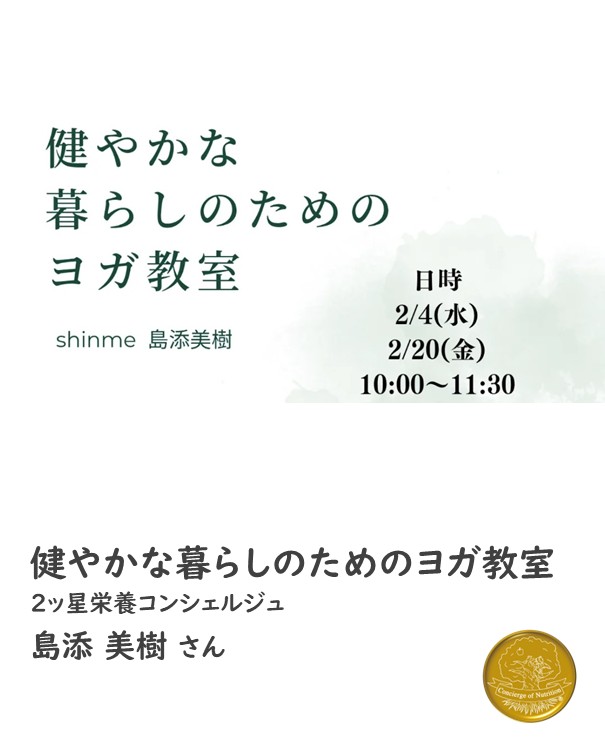 2ッ星栄養コンシェルジュでヨガ講師の島添美樹さんが2月4日(水)、2月20日(金)に福岡にて開催される、『健やかな暮らしのためのヨガ教室』にて講師を務められます☆