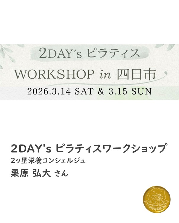 2ッ星栄養コンシェルジュでFRピラティスマスタートレーナー・健康運動指導士の栗原弘大さんが3月14日(土)、15日(日)に三重にて、『2DAY's ピラティスワークショップ』を開催されます☆