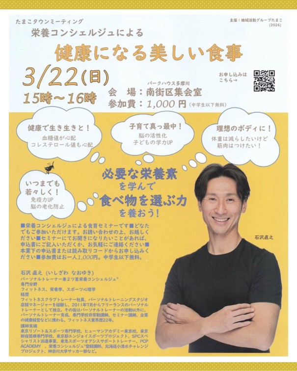 2ッ星栄養コンシェルジュでライフスキルコーチの石沢直之さんが3月22日(日)に東京にて栄養セミナー、『健康になる美しい食事』にて講師を務められます☆