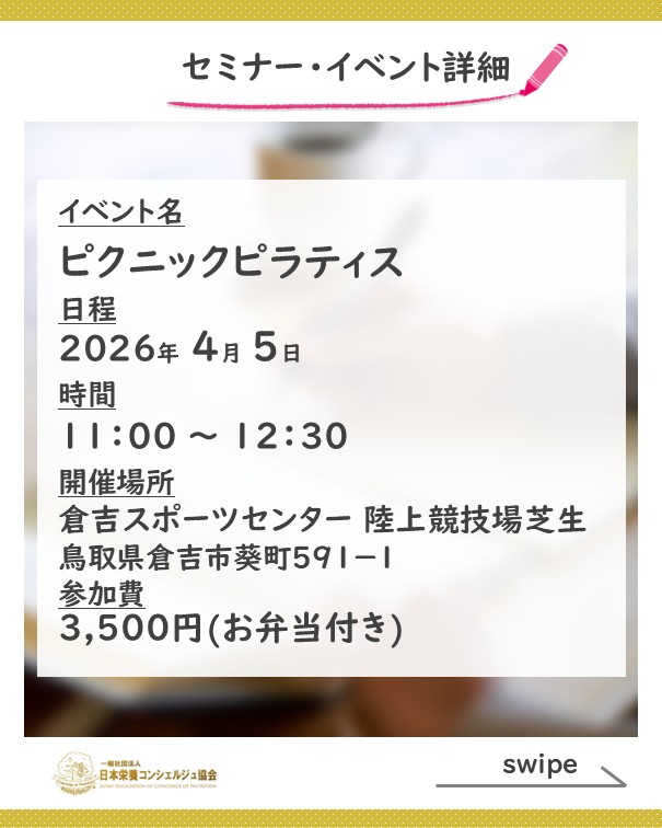 2ッ星栄養コンシェルジュでピラティスインストラクターのHARUさんが4月5日(日)に鳥取にて、『ピクニックピラティス』を開催されます☆