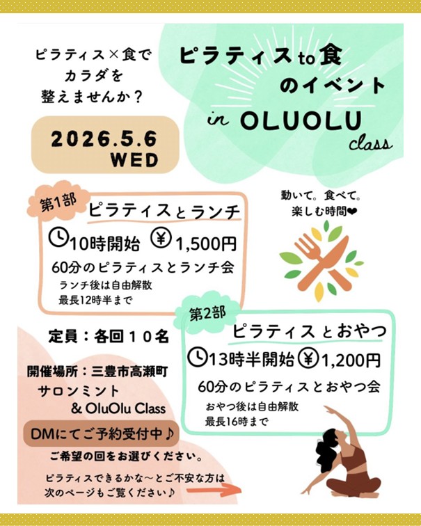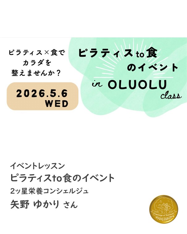 2ッ星栄養コンシェルジュで健康運動指導士・ピラティスインストラクターの矢野ゆかりさんが5月6日(水)に香川にて開催されるイベントレッスン、『ピラティスto食のイベント』にて講師を務められます☆