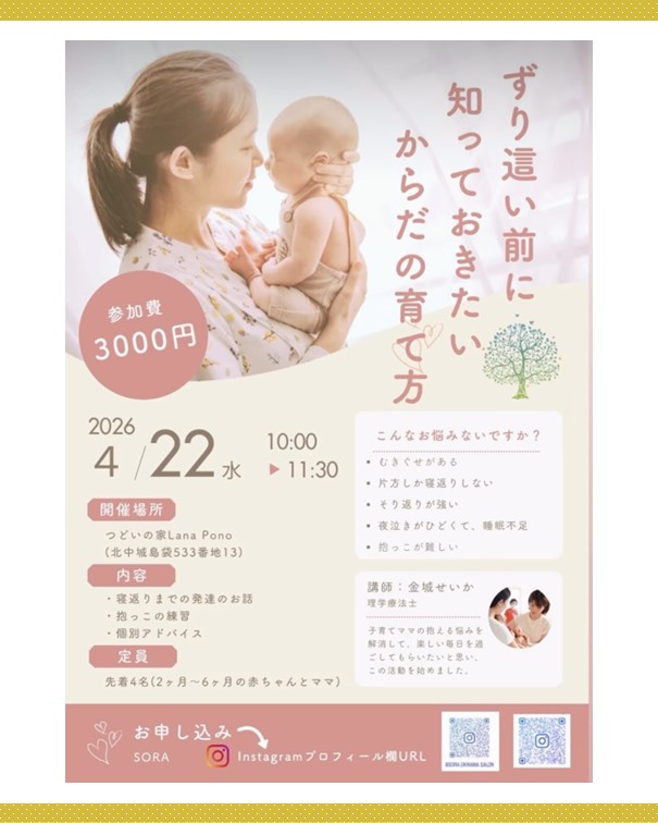2ッ星栄養コンシェルジュで理学療法士の金城せいかさんが4月22日(水)に沖縄にて開催されるイベント、『ずり這い前に知っておきたい♡からだの育て方』にて講師を務められます☆