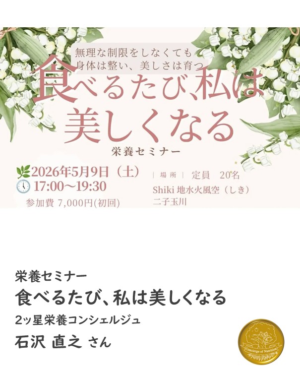 2ッ星栄養コンシェルジュでライフスキルコーチの石沢直之さんが5月9日(土)に東京にて開催される栄養セミナー、『食べるたび、私は美しくなる』にて講師を務められます☆