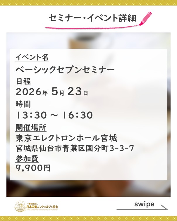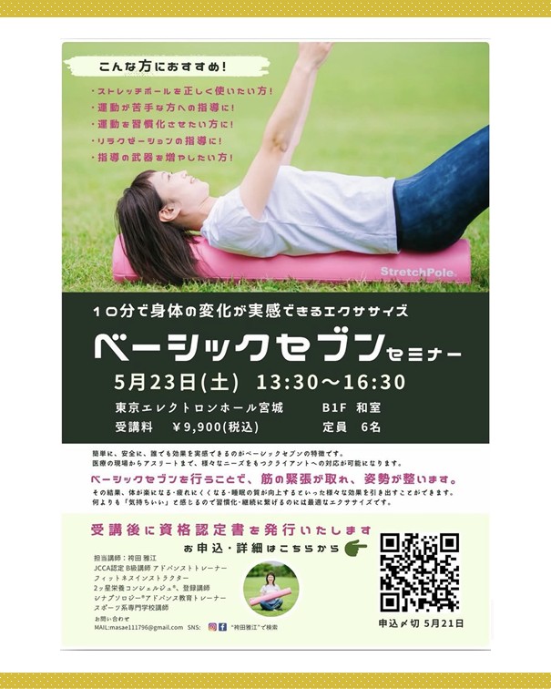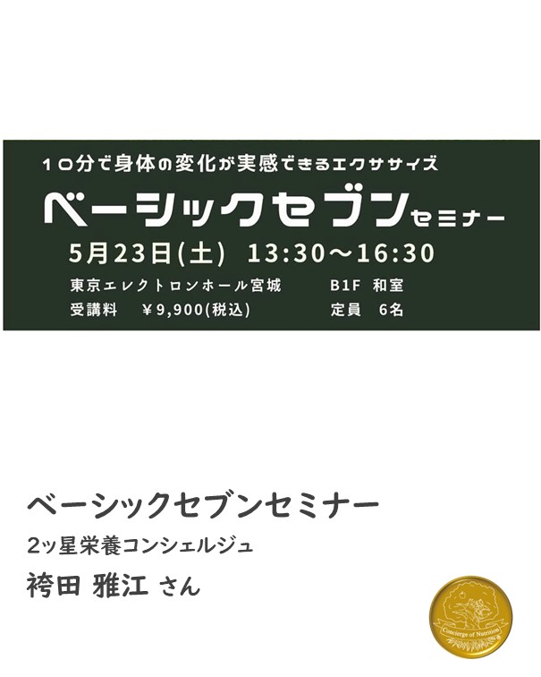 2ッ星栄養コンシェルジュでフィットネスインストラクターの袴田雅江さんが5月23日(土)に仙台にて開催される、『ベーシックセブンセミナー』にて講師を務められます☆