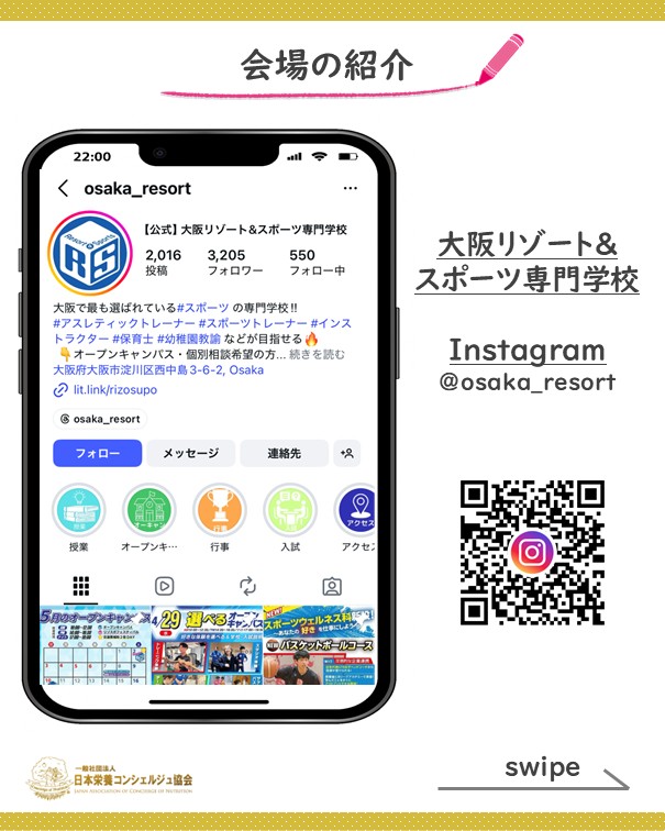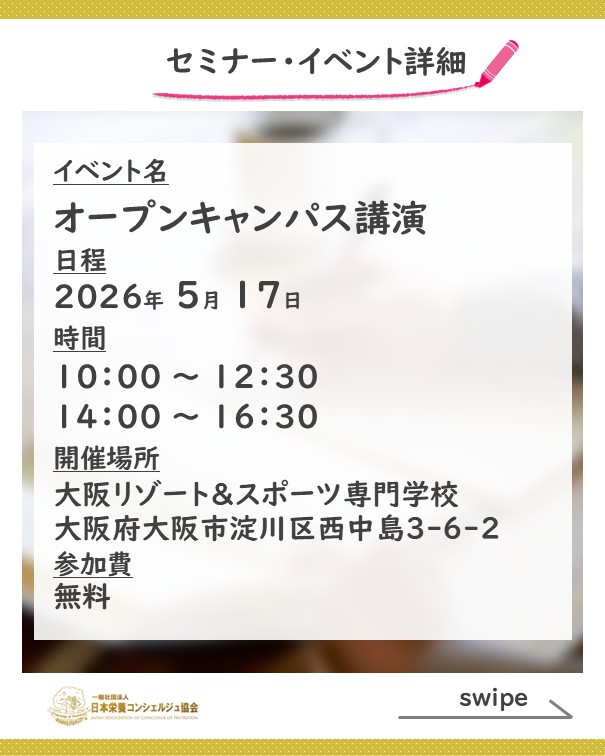 1ッ星栄養コンシェルジュでトレーナーの三橋孝史さんと日本栄養コンシェルジュ協会 管理栄養士の廣瀬直樹が大阪リゾート&スポーツ専門学校にて行われるオープンキャンパスにて講演します!